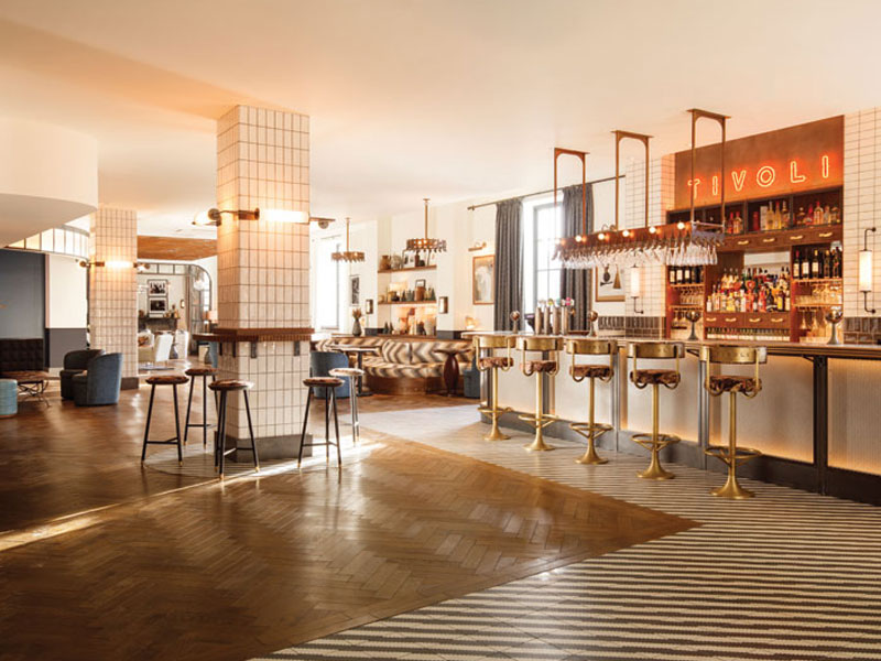 Tivoli’s new concept for cinema is alluded to by the new ‘key’ logomark developed by Run For The Hills. The designers state that the key logomark refers to some mystery between TIVOLI’s various elements… a ‘key to unlocking the infinite visual senses’. A pattern made from the logo is repeated throughout the venue’s screening and dining spaces, on everything from tickets, popcorn buckets and coffee cups, to the carpet in the screening rooms. Yet the cumulative effect of all this does not overwhelm, and the more lasting sense is one appropriate to cinema, of light and dark and an enticement to move between them. Spaces vary in illumination: starting from an entrance where brass handrails appear chiaroscuro out of the shadows, Tivoli offers a welcoming entrance into the otherworldly, ineffable glamour of the cinema.