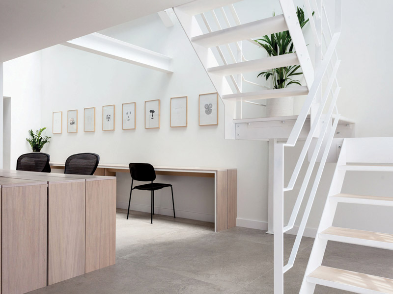 A mezzanine level has been created between the ground and first floor, housing a staff craft area and kitchen. Breaking from the minimal colour palette, a bold injection of colour in the form of a pale pink canvas stretches across the craft area. A terrazzo splash back extends around the kitchen. This pause in the colour scheme demarcates the mezzanine as a gathering area, already a focal point as it announces itself, protruding into the building as you enter, thanks to the removal of the lobby partition wall.