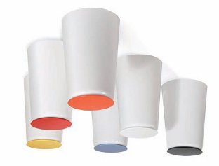These stools are made of old street-lamp shades that just happened to be the perfect height for a stackable seat. A seat surface in high gloss HI-MACS has been added, available in various colours.