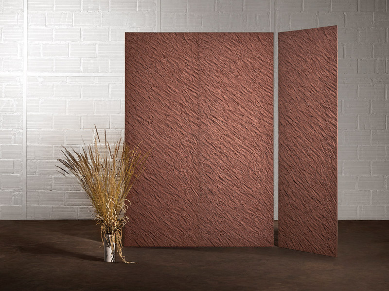 Panbeton panels, made of raw concrete on lightweight foam beds, imitate solid concrete walls. In this new collection, Studio LCDA look at weatherworn facades, Herkner inlays fragments of contrasting materials, while Parente uses gestural textures.