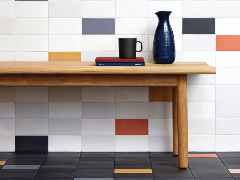 Glazed porcelain tiles are available in three versions of five colourways inspired by London's streets: Base, subtle and tonal palettes; Poly, which features occasional contrasting colours, and Mono, with the contrasts of Poly but in monochrome.