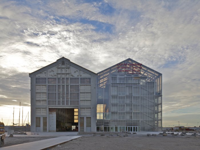 Two volumes, each 75m long, stand conjoined on a rectangular plan, with parallel pitched roofs and flat facades. Their forms may be as mundane as Monopoly houses but they loom with a magnificent, monstrous scale over their maritime, industrial surroundings. The original volume is the opaque AP2 hangar, opened in 1949. From here, until 1988, shipbuilder Chantiers de France despatched all manner of great vessels. It was long-known locally as 'the cathedral' because of its vastness and profile.