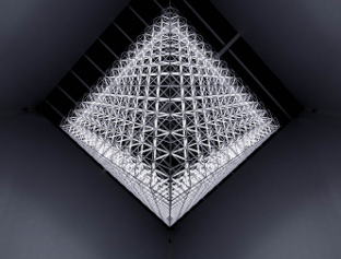 Made of aluminium, steel and monochromatic LED the sculpture, called 'Fragment', is an inverted pyramid composed of 421 octahedron frames and suspended in a day-lit atrium, catching and reflecting light downwards into space.