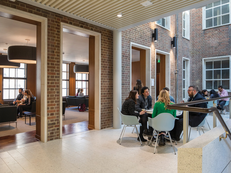Socialising and informal group working space is provided between the main staircase and the link to Bentham House