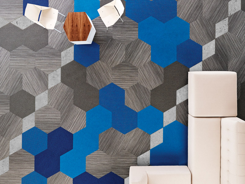 Hexagon from Shaw Contract Group is, as the name suggests, a hexagonal carpet tile. Made using 44 per cent recycled materials, it is available in a range of 29 colours of varying hues, designed to complement each other to create diverse aesthetic effects. shawcontractgroup.com