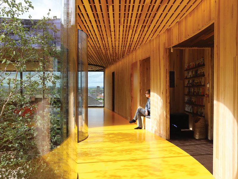 The calming effect of wood is part of de Rijke’s broader argument about wood’s many benefits. ‘I think tulipwood is a really beautiful material,’ de Rijke says, touching the finely grained timber. Structurally a double wall on the centre’s southern face, with two offices, toilets and other facilities sandwiched between the two curving walls, helps carry the load. The sensitivity extends to the broader materials palette, including cork wall screens and oak door handles, and raw uncut birch for the railing along the balcony. This is a rather different palette to dRMM’s usual application of bright, and at times, gaudy, colours, turning Maggie’s Oldham into an unusual dRMM project; one where their eco-sensibility is worn on their sleeves, rather than, mainly invisible on the other side of the walls. For de Rijke, the organic materials complement healthy organic food; the two are the exact ingredients so missing from both the NHS and so much of public architecture.
