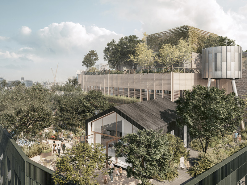 To support the weight of this living roofscape a lightweight hybrid steel and CLT frame will cope with the 1,300t of soil, not to mention the plants – 125 established trees and 10,000 new plants. The landscaping will not just prioritise community access – the premium rooftop zone, with the best views over the city of London will be dedicated to community and public use – but also carve out areas for undisturbed wilderness so that pollinators and other crawling creatures vital to the plant ecosystem can thrive, undisturbed.