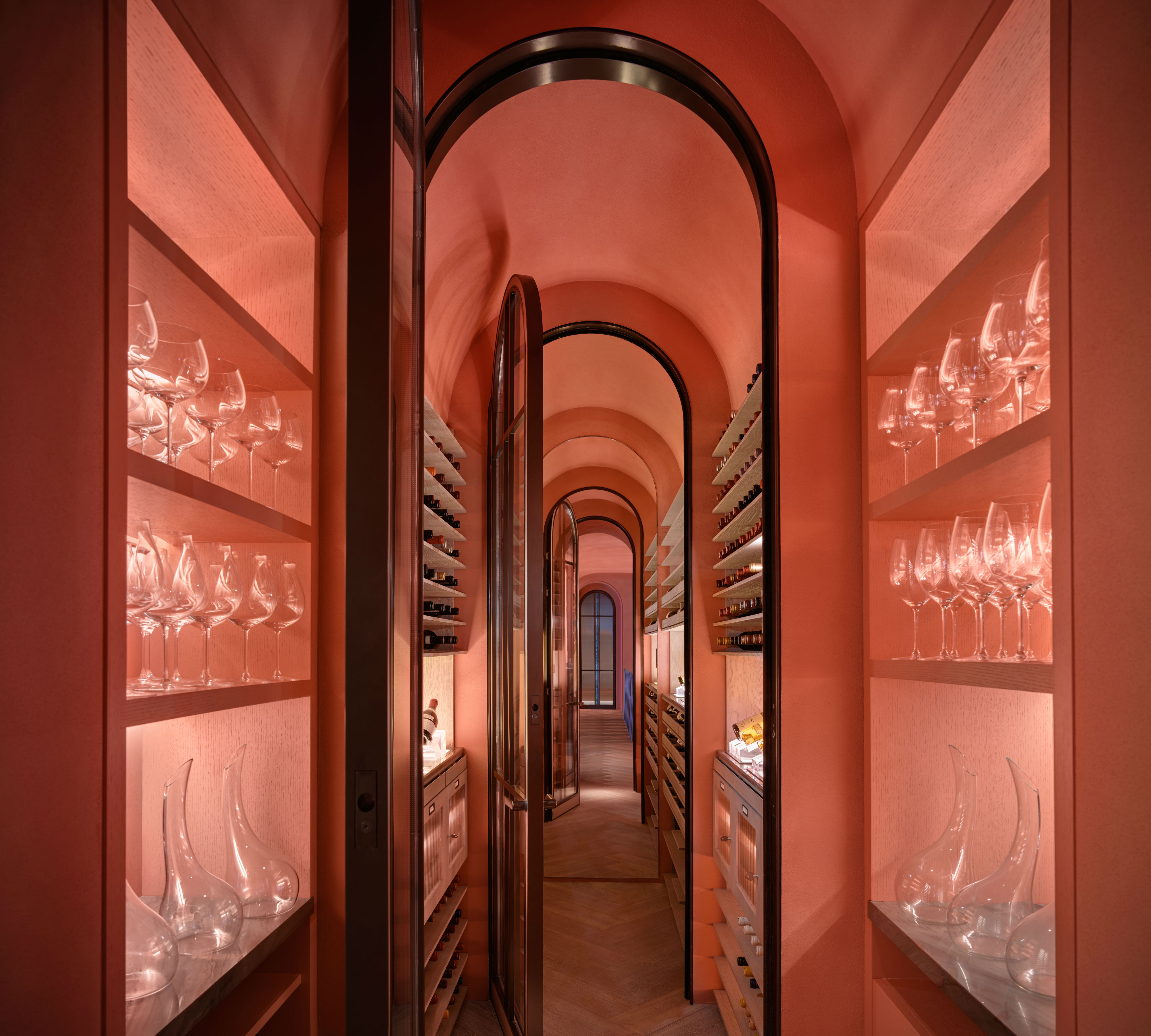 In the bar area, the design team has used a muted blush colour on the walls, pairing this with a sleek bar top and touches of teak and green. With high, arched ceilings also featuring in the bar, Yabu Pushelberg have tried to create a cosy, cocooning affect within the space; the studio also wanted to invoke a sense of curiosity in Arbor’s diners, by allowing them to look through the arches to peek at what lies beyond in the dining area.