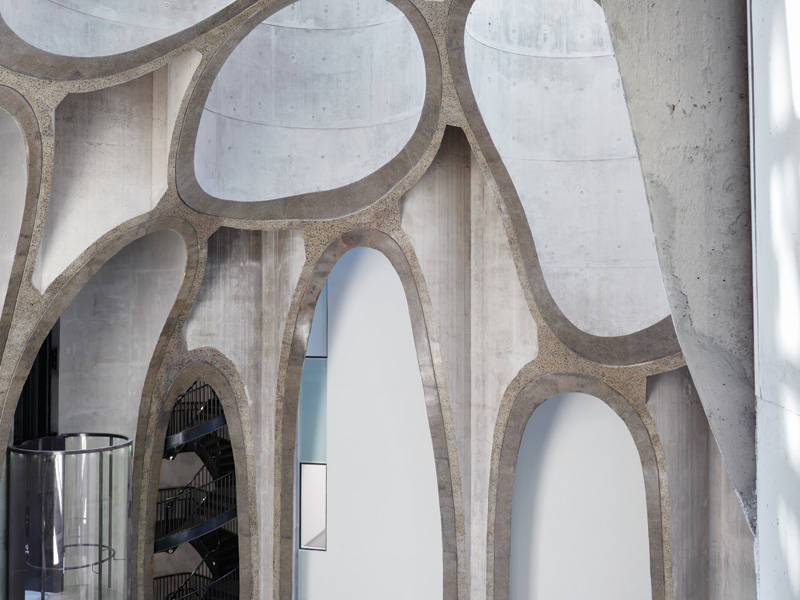 But first, there is another grand architectural gesture — the one visible from the outside. The silos themselves have been kept windowless, adding to the drama of the atrium and, on a more practical level, allowing complete light control for the 80 galleries that encircle and embrace its gothic heart. However, where the silos stop, a further floor with glazing appears. On the other building this continues up for a further four levels, topped off with an open frame. Where the silos are all curves, these crowning floors are subject to a sharply defined concrete grid. Inside the grid is glazing.