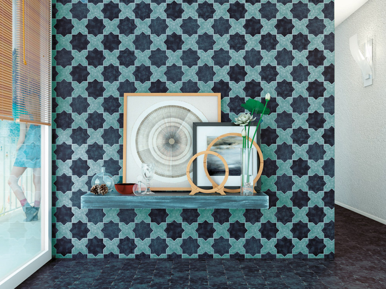 Becolors porcelain floor and wall tiles by Cevica are available as crosses or stars and come in 6 colours and 5 patterns in a 13.6x13.6cm format
