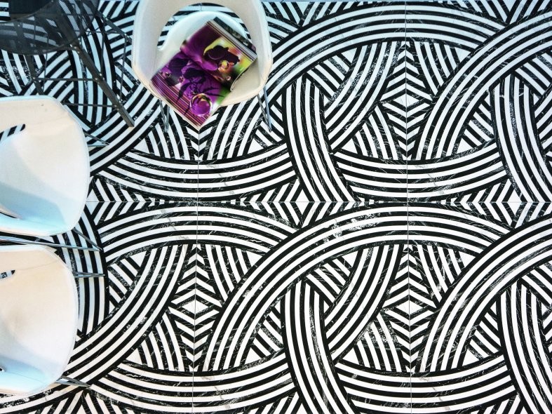 Porcelain floor tile with inlay effects, available in polished or natural finish, 100x100cm.