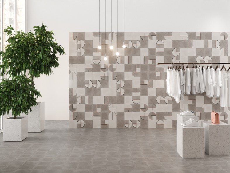 Porcelain tile in a small square format of 22.3cm x 22.3cm in 4 colourways including Décor tiles featuring 10 patterns that experiment with the geometry of the square.