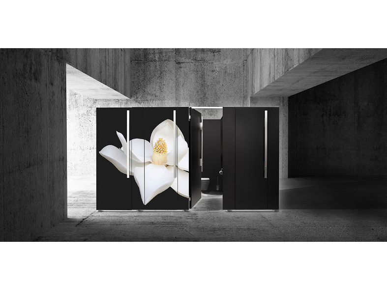 The design of the innovative Hard CELL cubicle system was inspired by nature and is modelled on the cell structure of honeycomb. The independent design of Hard CELL is particularly expressed in the front elements, which are asymmetrically folded.The unmistakable impression produced by this cubicle system results from the alternating broad and narrow front panels. The bold and distictive contours of Hard CELL add style to public washrooms. The unique 42 mm thick panels made of stainless steel, aluminium or steel, strengthen the visual impact.
