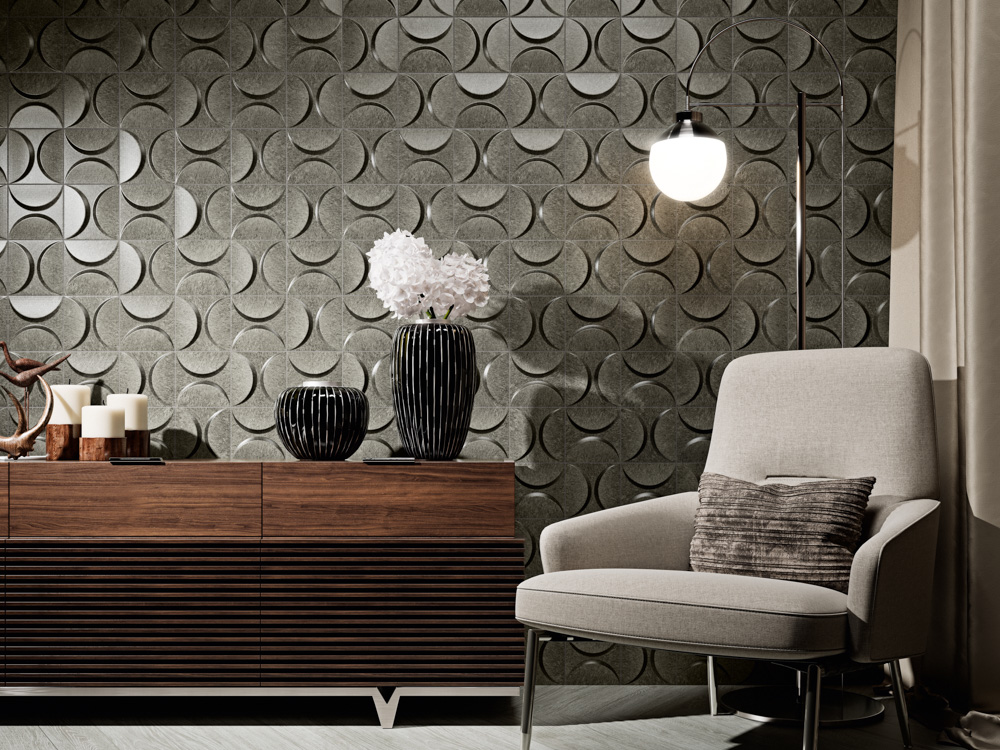Eclipse by Realonda features semi-circles that integrate light and shadow. Each 33x33cm porcelain format is available in 5 colours including iron (shown).