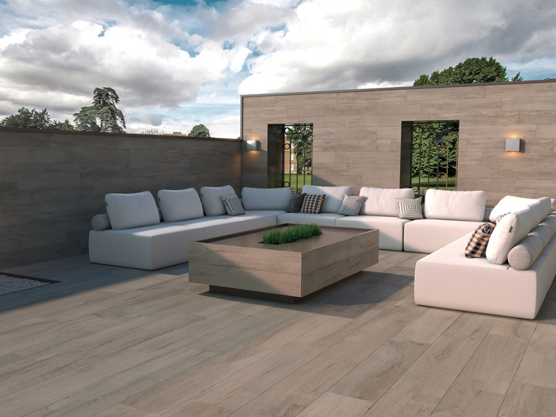 Everglow, a wood-effect porcelain plank by Rocersa, works well on a patio