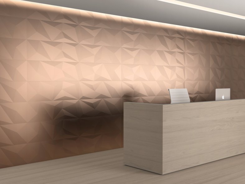 30x90cm ceramic wall tiles with pioneering lightweight matt titanium glaze and subtle geometric relief. Also available in white and in silver and gold effects.