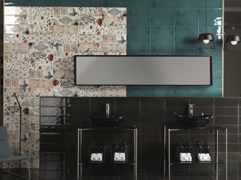Ceramic wall tile with a rich glaze in Turquoise and Deco White, 15x40cm.