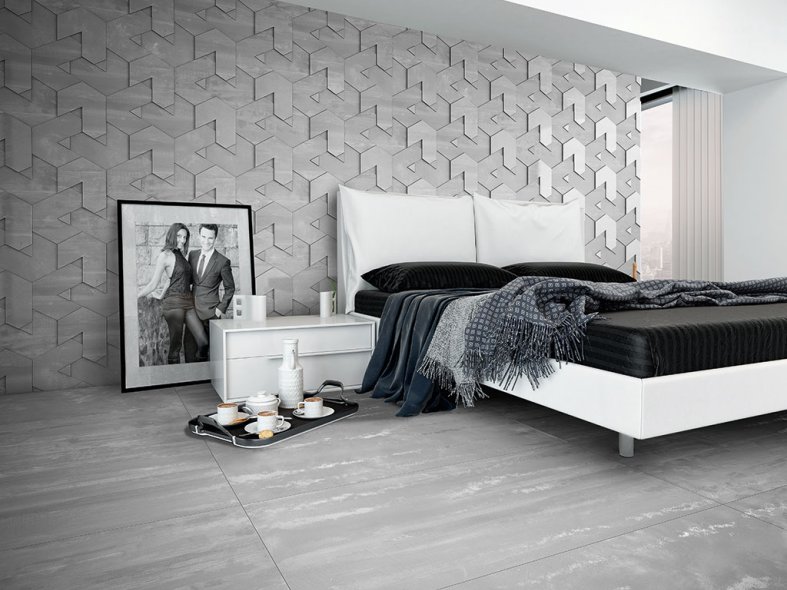 This relief-effect porcelain wall tile is Forma by Apavisa. Its interlocking shapes create a striking pattern and are available in 3 formats, 2 finishes and in 4 subtle colours.