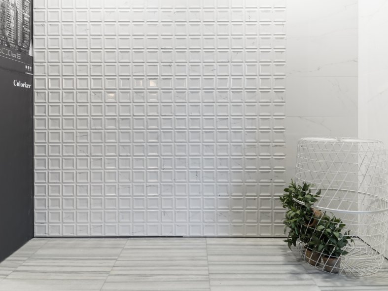 Lincoln by Colorker is a white ceramic tile in 2 formats for walls and 4 for floors, available in Window and Graphic designs with gloss or matt finishes.