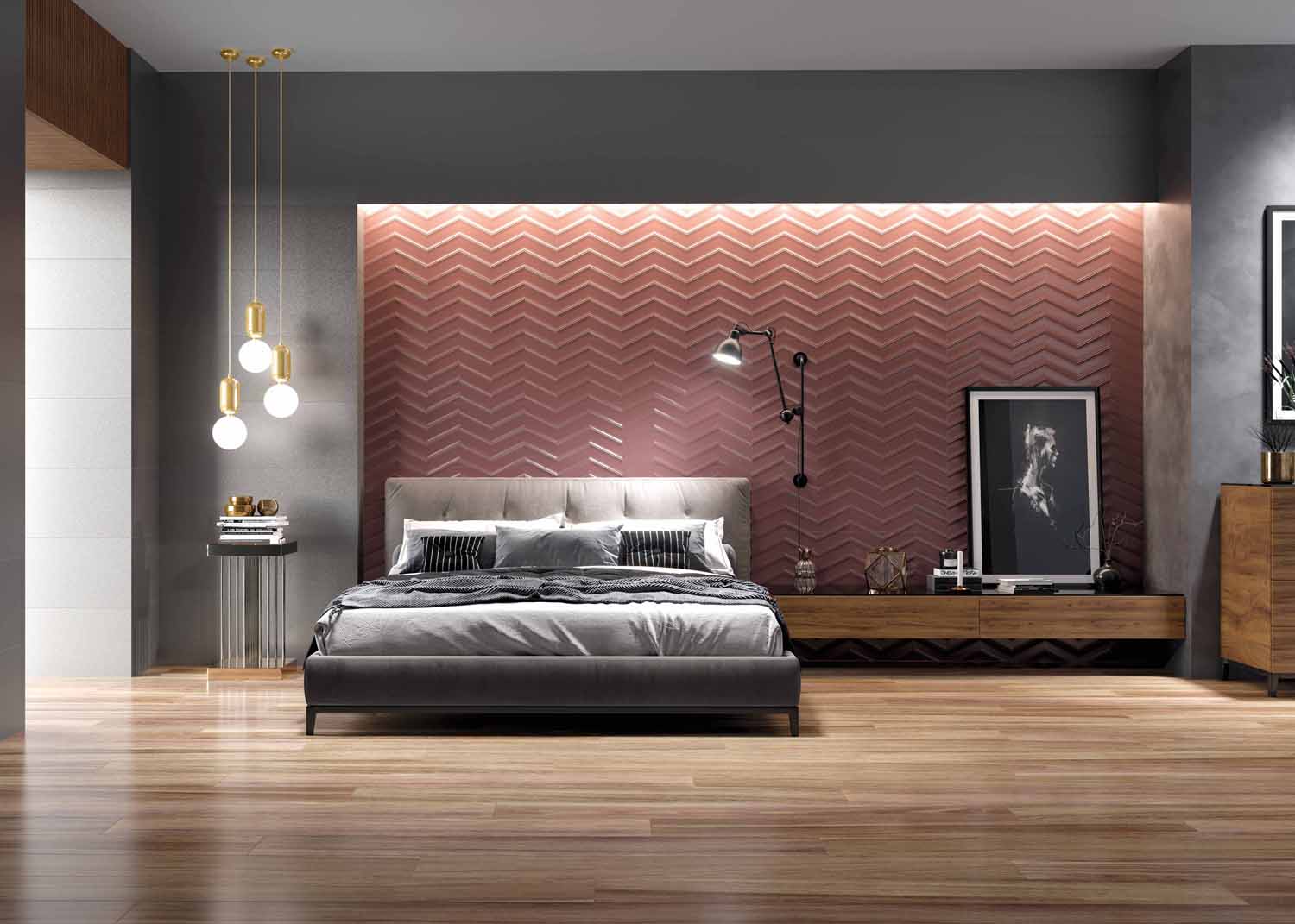 Look by Museum is a collection of 33.3x100cm wall tiles in blue, copper, white or metal that are available as a smooth matt format or two relief decors including the chevron design in copper shown.