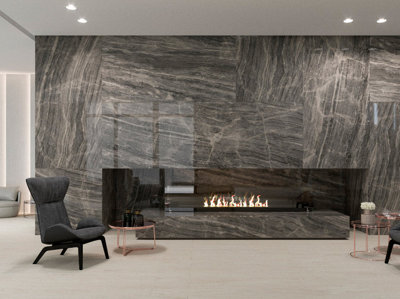 Dramatically veined Grespania’s Coverlam big-format porcelain tiles from its Medusa range make an impact on a wall. Various thicknesses and formats available.