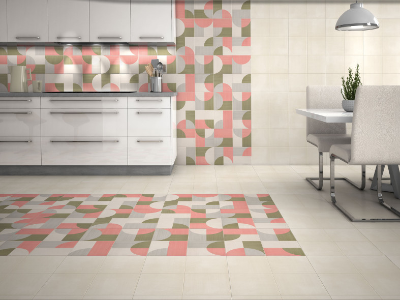 Retro porcelain tile with a satin matt finish for wall and floor in 10 designs with 4 patterned colours and 2 plain colours. 44x44cm format and in a 9mm thickness.