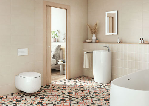 Niza by Roca is a hydraulic-style 20x20cm format with a contemporary palette of colours in either azure or coral suitable for walls and floors. www.roca.es