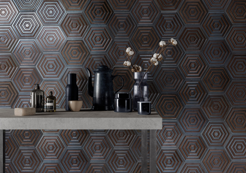 Orion by Bestile is a relief tile with a metallic effect in a 19.8x22.8cm hexagonal format available in iron, gold, silver and pink. www.bestile.es