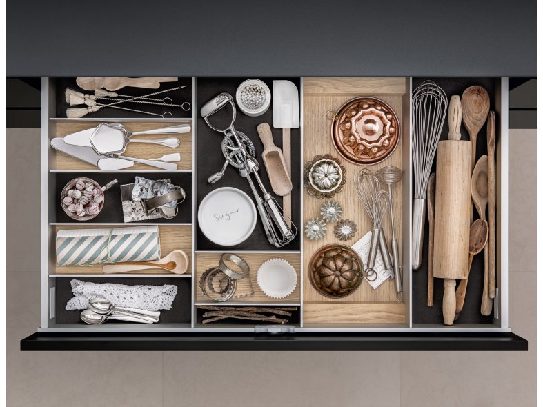 This storage system allows the internal drawers to be segmented so that everything is stored effectively, is well organised, easy to find and cared for. This breaks down into everything from individual compartments for separating cutlery and utensils to extra deep and wide drawers perfect for storing the largest pots and pans. It allows the internal drawers to be completely personalised to create highly individual solutions to storage needs.