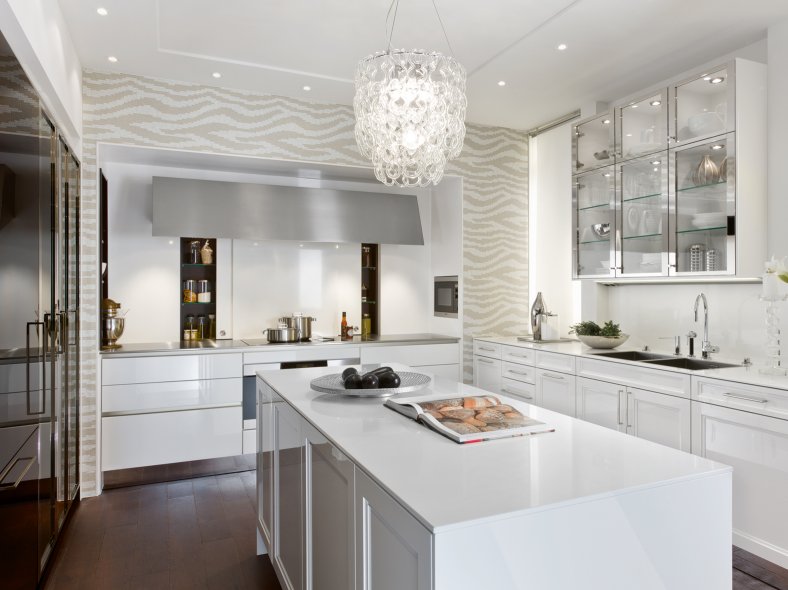 It features a mix of finishes including high gloss, polished nickel and stainless steel, different handles, door styles and dimensions, to create a unique style. The careful proportions used across the kitchen ensure the classic and contemporary elements work together.