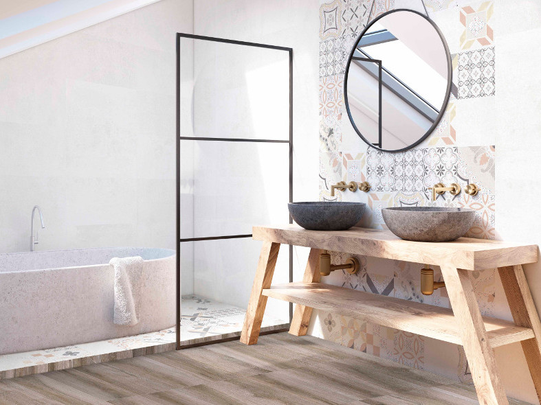 Porcelain tiles in a soft pastel palette offered in 12 designs that can be randomly mixed on walls and floors in a 20cm x 20cm format.