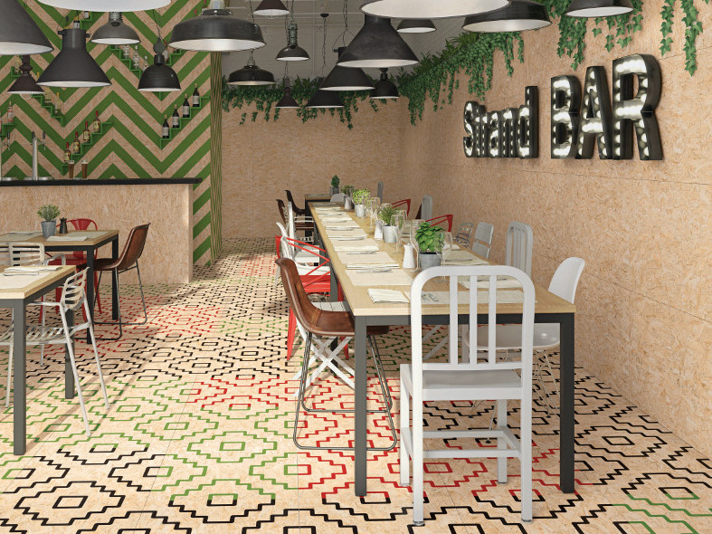 Porcelain floor tiles in 120cm x 120cm, 59.3cm x 119.3cm and 59.3cm x 59.3cm formats and a chipboard-effect look.