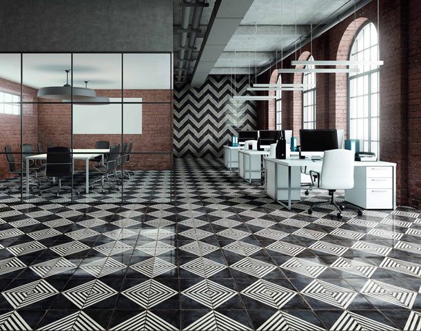 Extruded porcelain wall and floor tile available in 18 designs, six formats and six colours including 22.5cm x 22.5cm format in Caviar. www.natucer.es