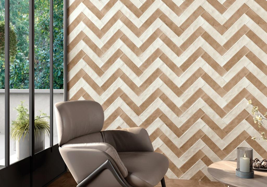 Handmade-look tile in three different shapes including a square, hex and brick 8.5cm x 35cm format (shown) in four earthy hues.