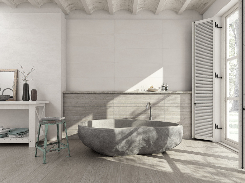 Wabi Sabi by Grespania features 3 notably different designs including Concrete, a cement look with subtle spatula effects in a 31.5cm x 100cm format.