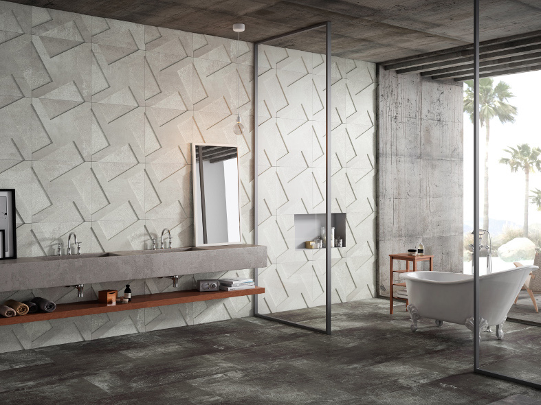 Porcelain square tiles in a 59.55cm x 59.55cm format that contrasts hammered and natural finishes with a 3D relief in white, back or blue