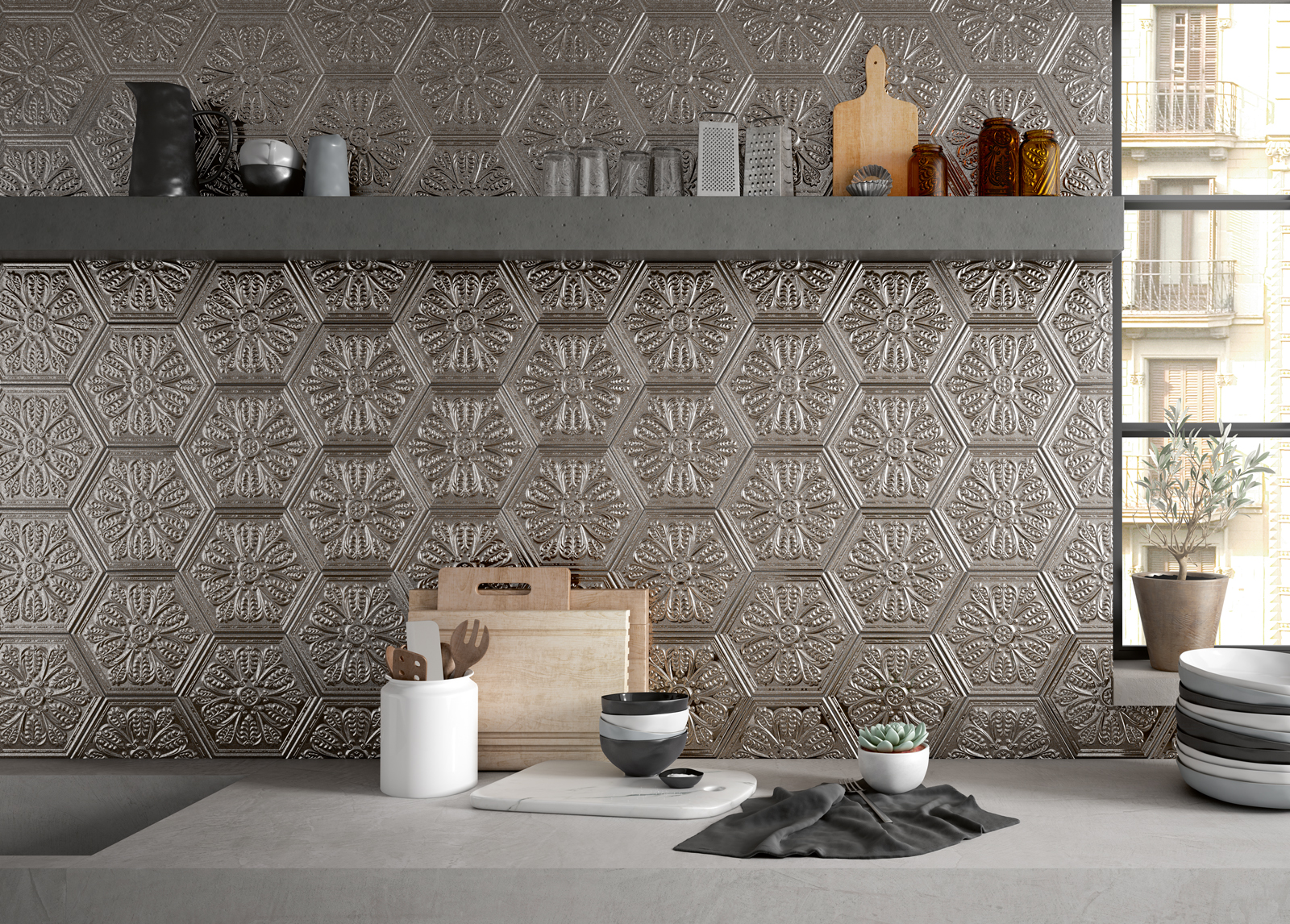 Zinc by Apavisa are 3D gres porcelain relief tiles that come in a variety of formats including a 25x29cm hexagon.