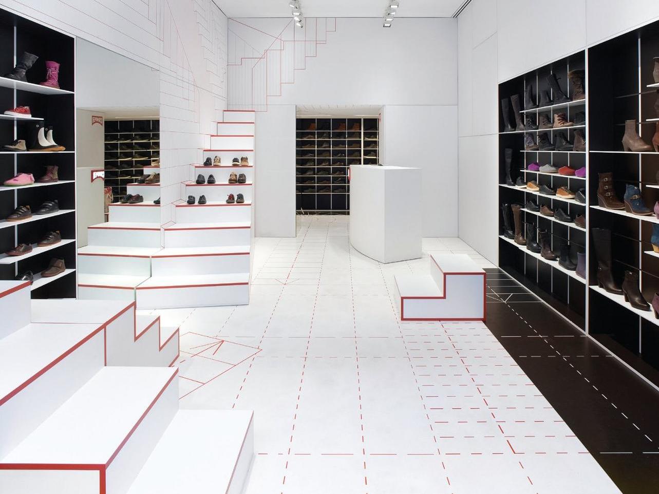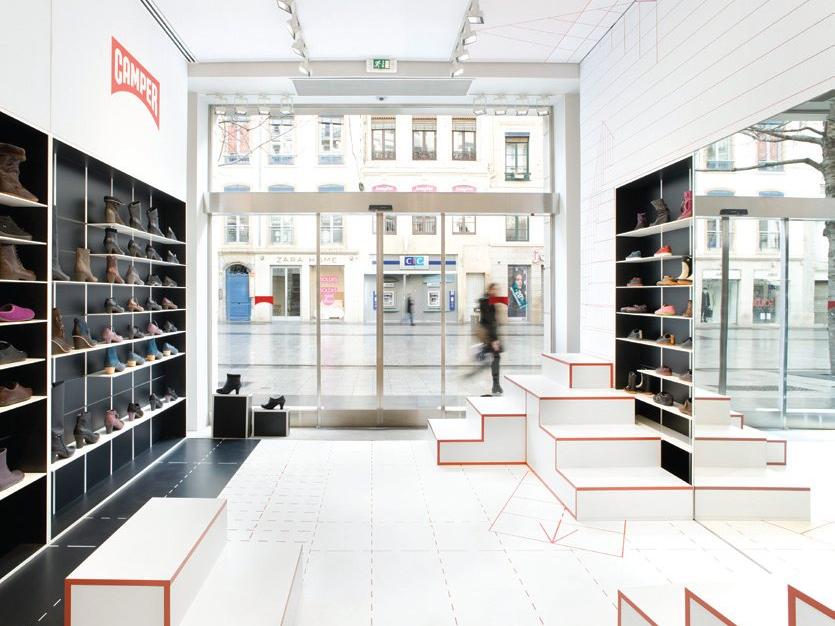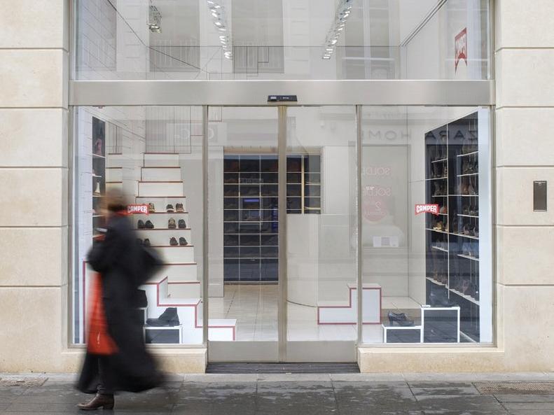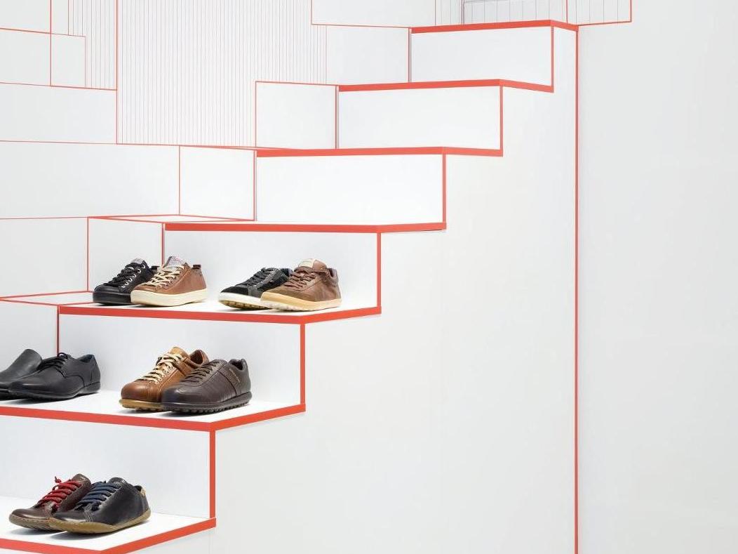 Short flights of steps are used by customers to try on the Camper shoes.