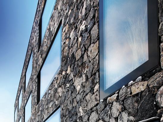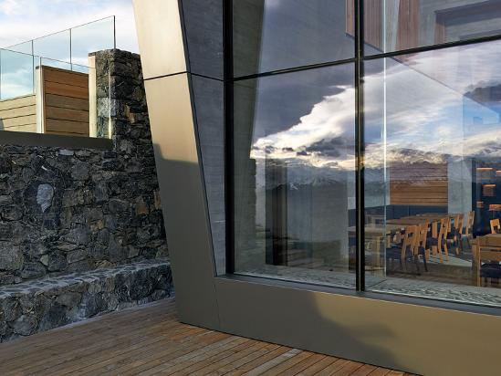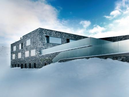 The atmosphere of the interiors is plush and cosy, while the restaurant features a cascade of terraces where guests can enjoy the bright alpine sunshine. Noble, classic, warm materials - notably stone and oak - are used inside the hotel, from the central lobby to the bedrooms, for a feeling of safety and warmth in the rugged high-mountain environment. The facades are covered with local stone contrasting with the industrial architecture and big horizontal window frames, and lead the eyes toward the outdoors.