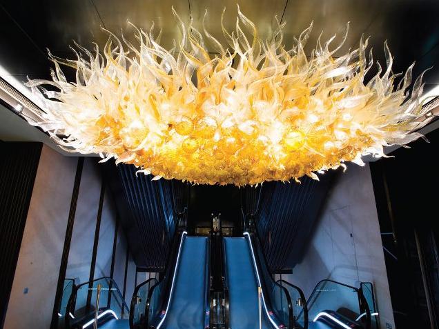 The new escalators are topped with Amber and Gold, a chandelier created for the space by American glass artist Dale Chihuly.