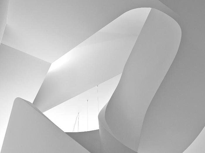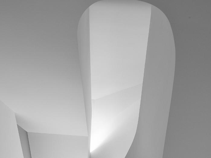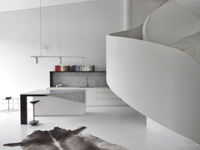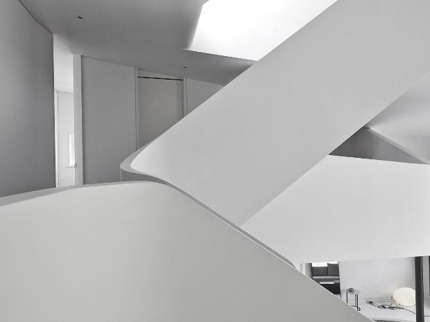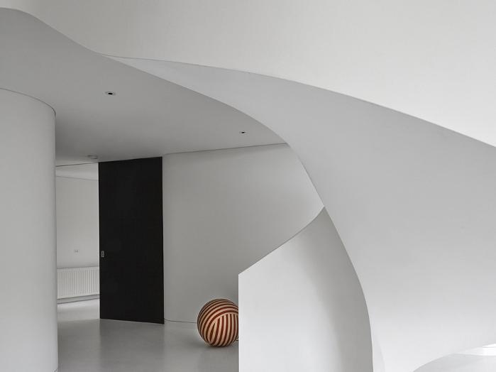 Walls sinuously move and bend through the apartment, with everything organised around a slowing sculptural staircase.