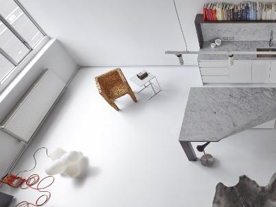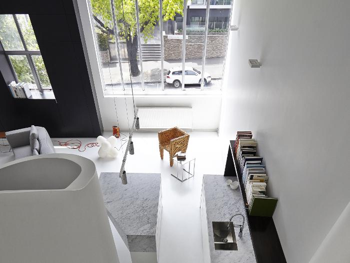 A monochrome palate of white on white with touches of charcoal and black makes the most of abundant natural light, which floods the apartment from generous north-facing window and a ceiling void.